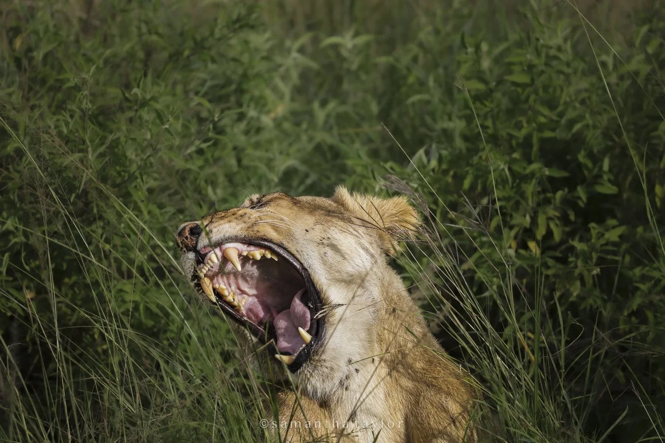 A lioness with her mouth wide open, showing sharp teeth, in tall grass and green foliage.