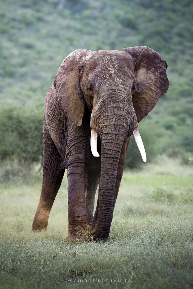 A large adult elephant standing in a grassy field with a blurred green hillside in the background.
