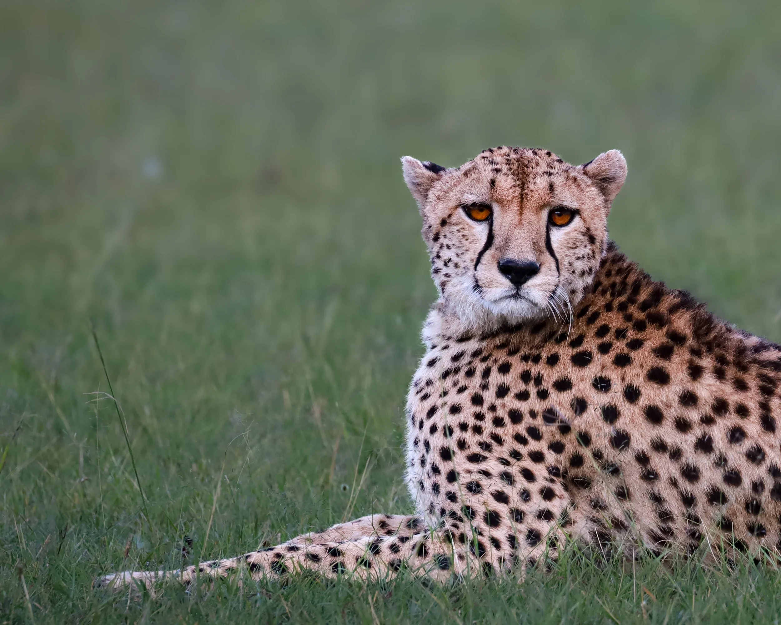 A cheetah lying on the grass with a blurred green background. View fullsize