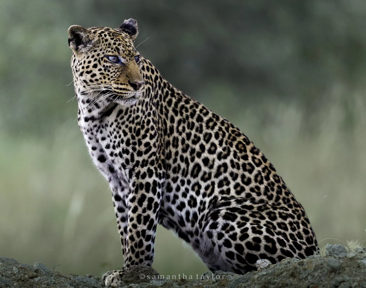 A close-up photo of a sitting leopard with a green blurred background. View fullsize