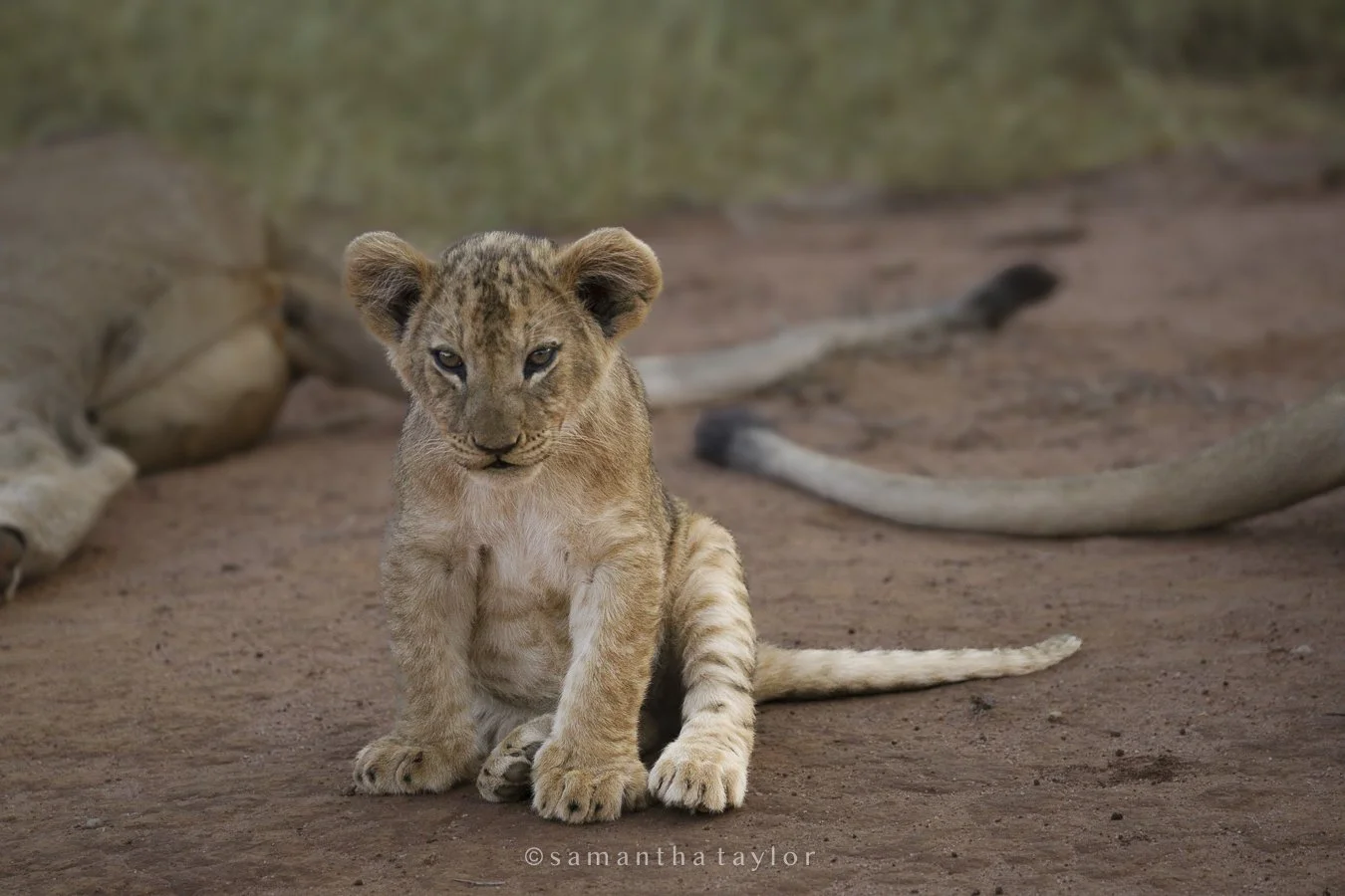 A young lion cub sitting on the ground with a lioness lying behind it in a natural setting. View fullsize