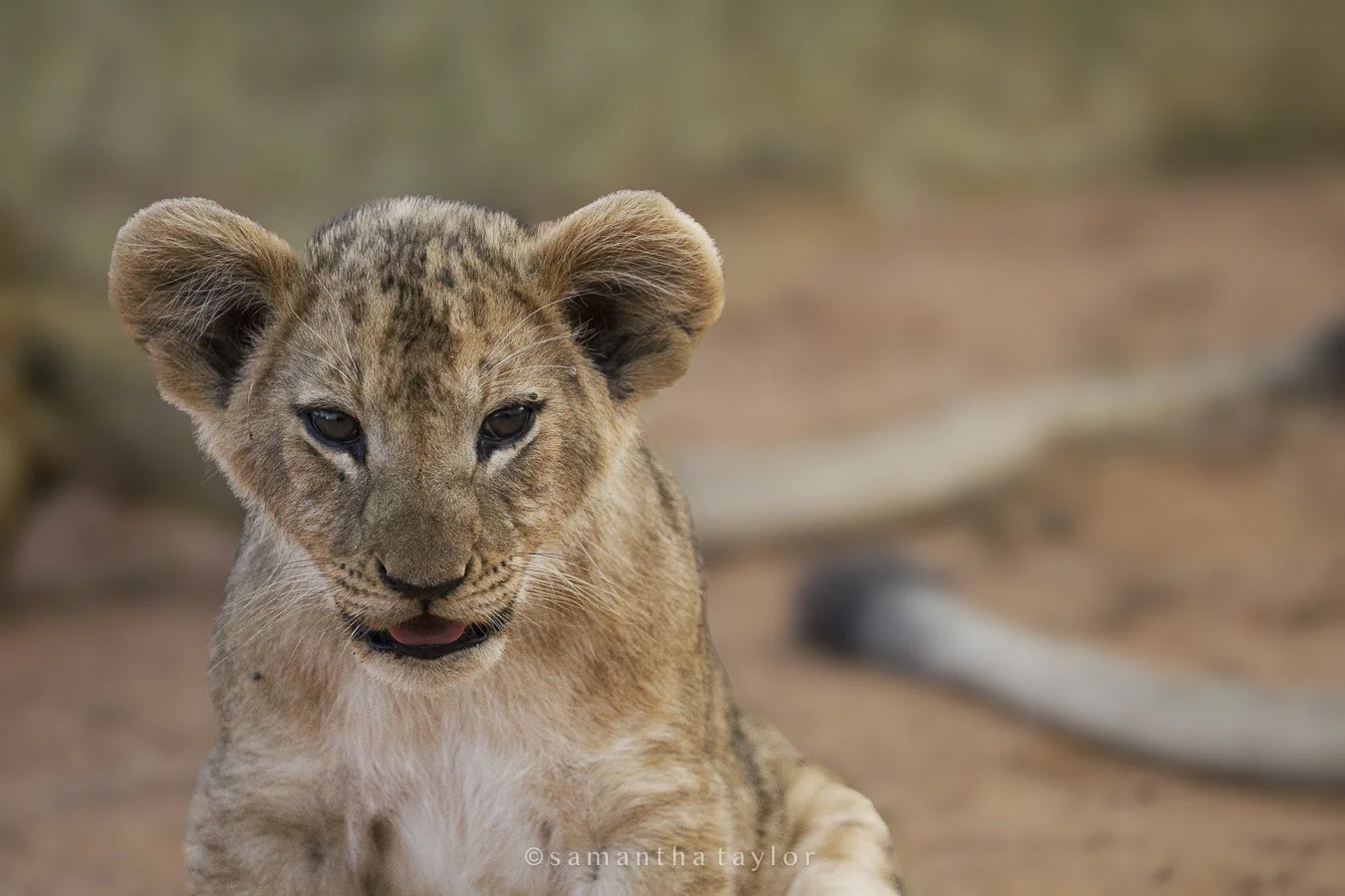 Close-up of a young lion cub with a sandy background.
